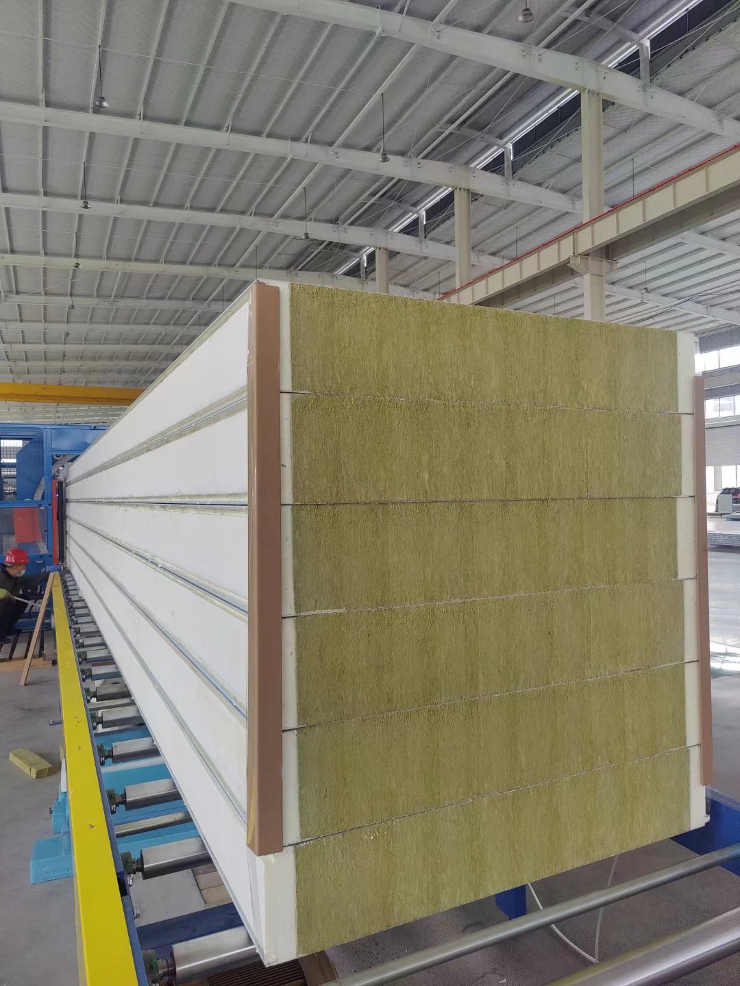 聚氨酯封邊巖棉夾芯板是使用漢高或者亨斯邁膠黏劑,使用霧化噴膠工藝,聚氨酯封邊巖棉夾芯板粘合度好,防火性能佳,其兩側的聚氨酯封邊 還能很好的起到防水作用。在巖棉芯材和聚氨酯封邊的雙重作用下聚氨酯封邊巖棉夾芯板擁有良好的防火、保溫、防水性能。